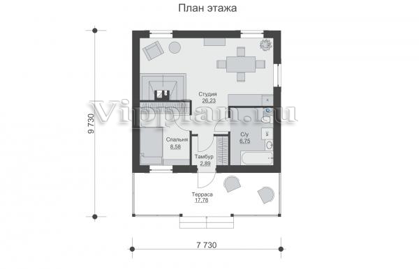 | Размеры дома: | 9.73м×7.73м |